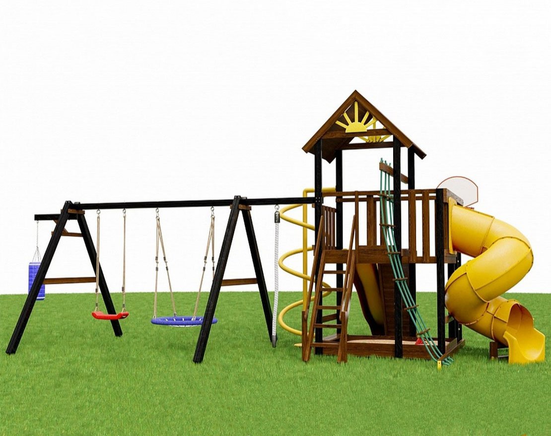 Комплекс выполнен из массива карельской сосны, качели - сборный брус 90х95мм. Окрашен методом полного погружения — защита от солнца и осадков надолго. Все поверхности тщательно отшлифованы, пластик прочный и безопасный.