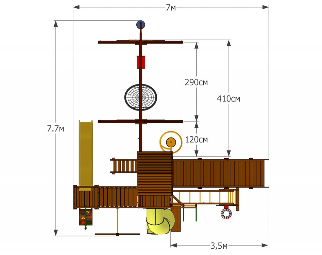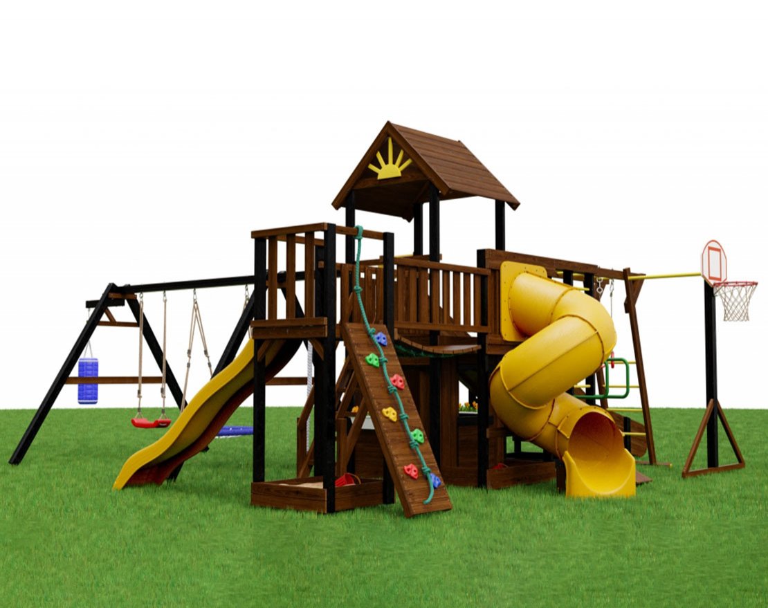 Цветовая гамма комплекса гармонично вписывается в любой ландшафт. Материал — карельская сосна с гипоаллергенным покрытием, устойчивым к ультрафиолету.