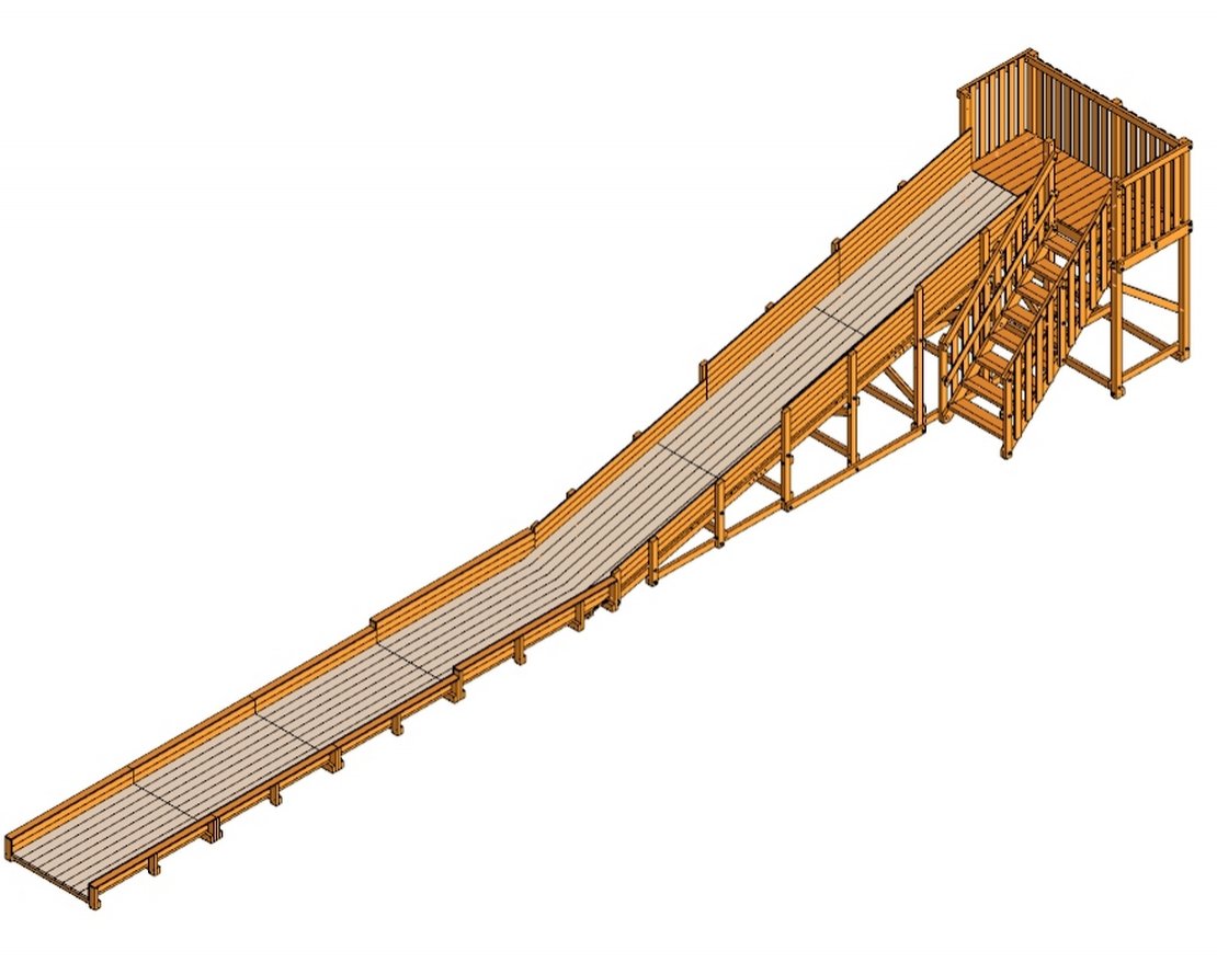 Данный модуль прикручивается к Зимней горке болтами, далее между секциями также соединяется между собой болтами и является продолжением ската, ширина ската 1250 мм.