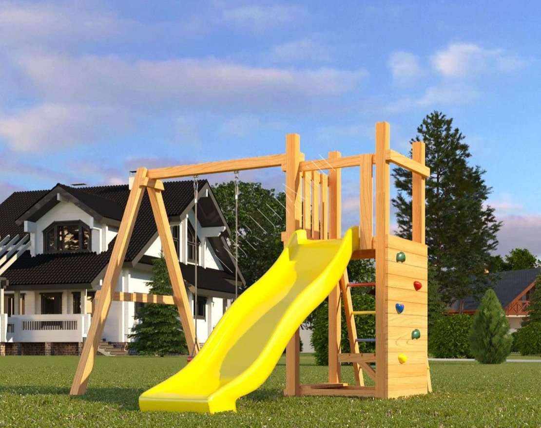 Площадка наполнит досуг детей энергией и радостью. Она компактная и займёт всего лишь несколько квадратных метров участка дачного или загородного дома. Покрытие с антисептиком защитит натуральные составляющие от непогоды (наносится самостоятельно).