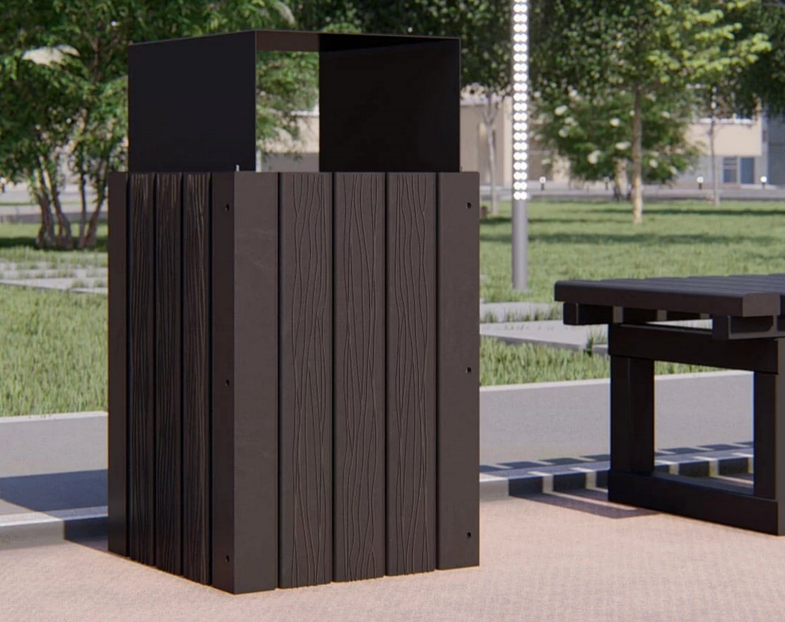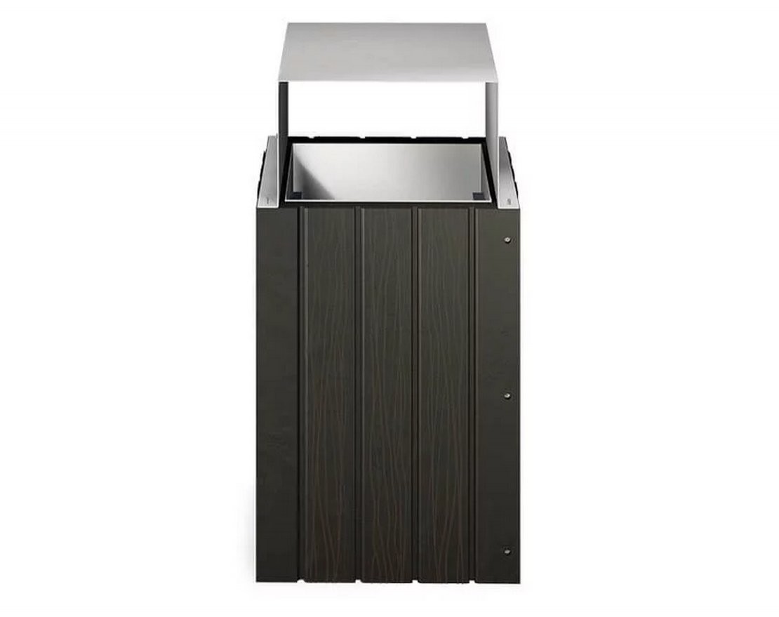 Функциональная уличная урна с металлической конструкцией сверху может располагаться у входа в ТЦ, БЦ, магазины и банки, а также дополнять парковые скамьи. Для удобства пользования урна оборудована съемным контейнером для мусора и навесом для защиты от осадков.