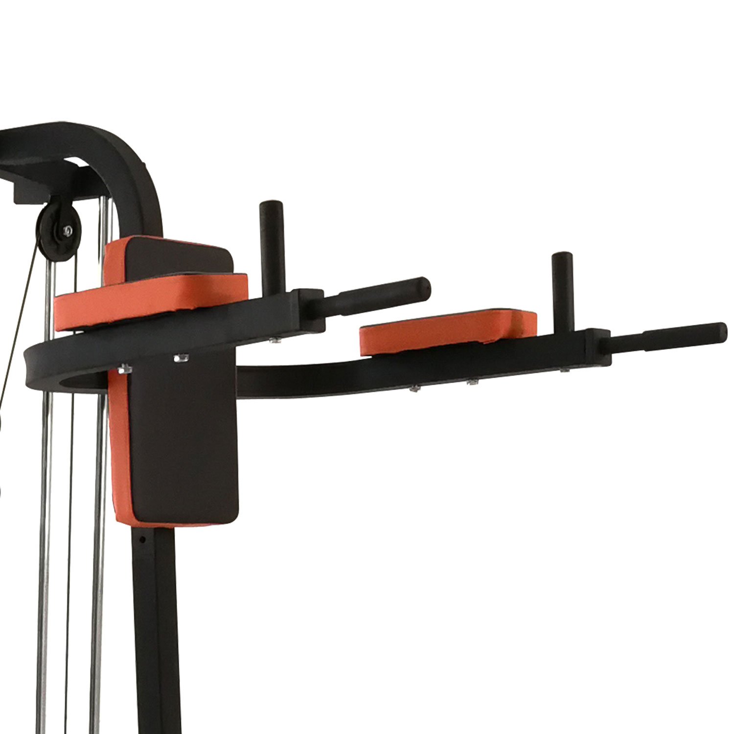 Многофункциональный тренажер с встроенным весовым стеком. Позволяет выполнять комплекс упражнений на различные группы мышц. Дополнительно тренажер имеет брусья для отжимания и степпер с гидроцилиндрами.